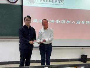 院党委书记韩文生教授向王乾坤老师赠送礼物,并表达了对王老师的殷切期望:一是期望王老师在师德师风方面,提升思想认识的高度与广度,积极参与各项活动,充分发挥自身优势特长,练就过硬本领;二是期望王老师在教学、科研方面深入钻研,向资深教授学习,提升授课水平,丰富教学经验;最后,韩书记祝福并感谢王乾坤老师加入商学院大家庭,希望王老师能快速融入,与师生携手共进,为商学院的发展贡献力量。