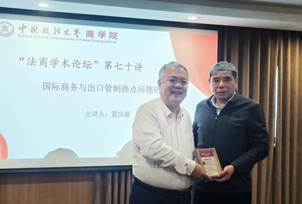 2025年11月27日,商学院“法商学术论坛”第七十讲圆满举行。本次论坛特邀全国国际商务专业学位研究生教学指导委员会秘书长、对外经济贸易大学国际经济贸易学院副院长蓝庆新教授,聚焦《国际商务与出口管制热点问题研究》,深度探讨国际商务出口管制教学科研、师资队伍与学科建设相关话题。本次讲座由商学院院长商文江教授致辞、副院长刘志雄教授主持,商学院副院长郭颖教授、国际商务系主任梁涵副教授、国际商务系张婷婷副教授为与谈人。