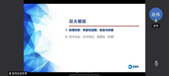 2025年10月22日晚,申万宏源首席经济学家赵伟应邀通过腾讯会议作学术报告,主题为“星火燎原——中国经济形势与展望”。本次讲座由商学院经济系、经济学党支部与对口支援高校伊犁师范大学霍尔果斯商学院联合举办,是“市场首席进校园”系列讲座的第二十讲(2025年第6讲),也是经济学党支部作为全国党建工作样板支部和全国高校“双带头人”教师党支部书记“强国行”专项行动团队相关工作的重要组成部分。本次讲座吸引了近80名师生在线参加。