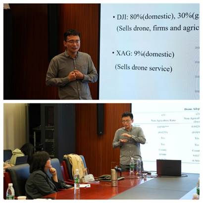 2025年10月16日下午,商学院经济系与经济学党支部在学院路校区综合楼814会议室成功举办了主题为“From the Sky to the Soil: The Effects of Drones on Agricultural Productivity in China”的青年学术研讨会。本次讲座特邀暨南大学经济与社会研究院马森副教授担任主讲嘉宾,吸引了众多师生积极参与,现场气氛热烈,学术氛围浓厚。