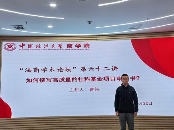 2025年10月22日下午,商学院在海淀校区成功举办了“法商学术论坛”第六十二讲。本次论坛特邀西南财经大学中国金融研究院教授、博士生导师曹伟教授担任主讲嘉宾,为师生们带来了一场题为“如何撰写高质量的社科基金项目申请书”的精彩讲座。讲座由商学院副院长刘志雄教授致辞,胡继晔教授主持,杨丽花教授、洪智武副教授与谈。