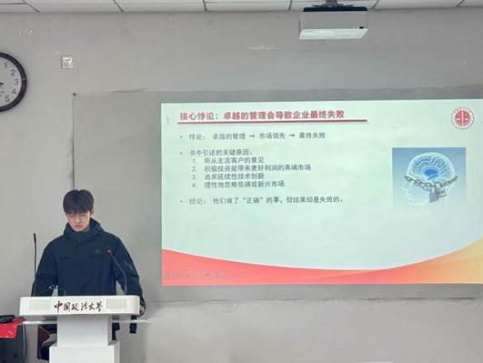 2025年10月29日上午,商学院工商管理系、工商管理党支部研究生第45期读书会在海淀校区教学图书综合楼0618教室顺利举行。本次读书会由张亚琼老师主持,2025级企业管理硕士生周文帆、张子阳同学主讲,沙枥窈、张爱妮同学点评。参与本次读书会的有工商管理系李璨老师、张亚琼老师以及2024级、2025级企业管理全体研究生,大家围绕张子阳、周文帆同学推荐的《创新者的窘境》展开讲述与讨论。