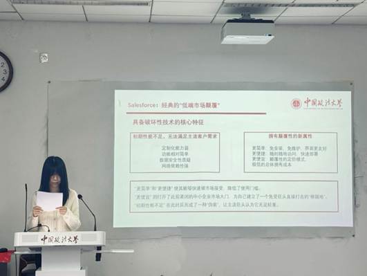 最后,与会老师对同学们的汇报进行了点评。其中,李璨老师和张亚琼老师指出ppt中大企业打压破坏性创新一词不合适,大企业更多是害怕,或者说是忽视破坏性创新,现实生活中,大企业打压中小企业的破坏性创新等情况比较少见。同时,老师们也肯定了同学们的思考,并鼓励同学们再接再厉。